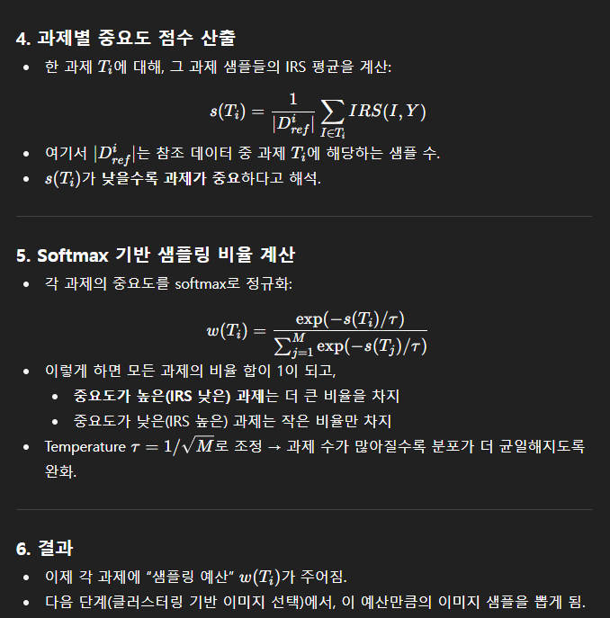 Task 의 번째 cluster에서 샘플을 선택할 때는, cluster의 상대적 크기 와 task의 중요도 가중치 를 모두 고려한다.