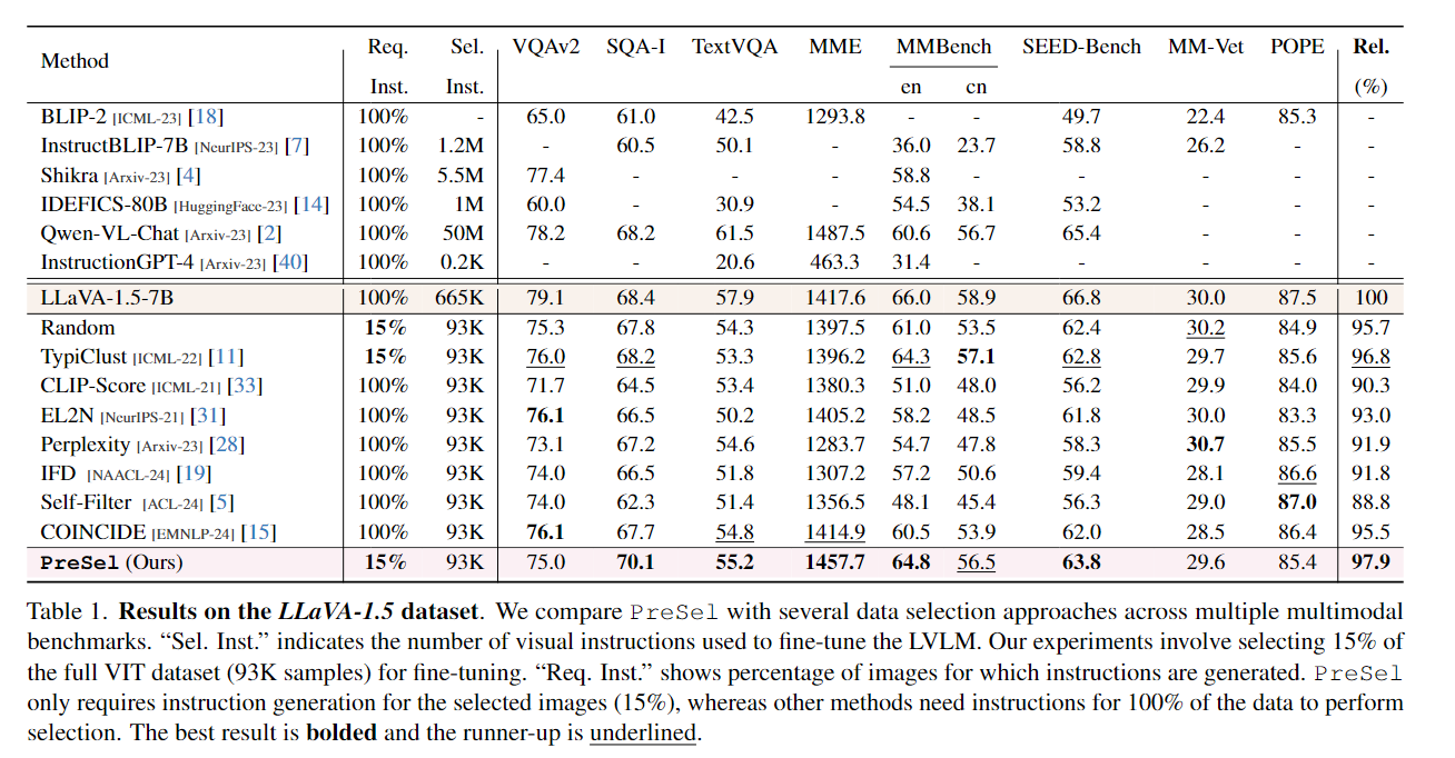 이때 PreSel은 전체 데이터 중 15%만 지시문을 생성했음에도 불구하고 성능 손실이 없고, 오히려 더 나음.
