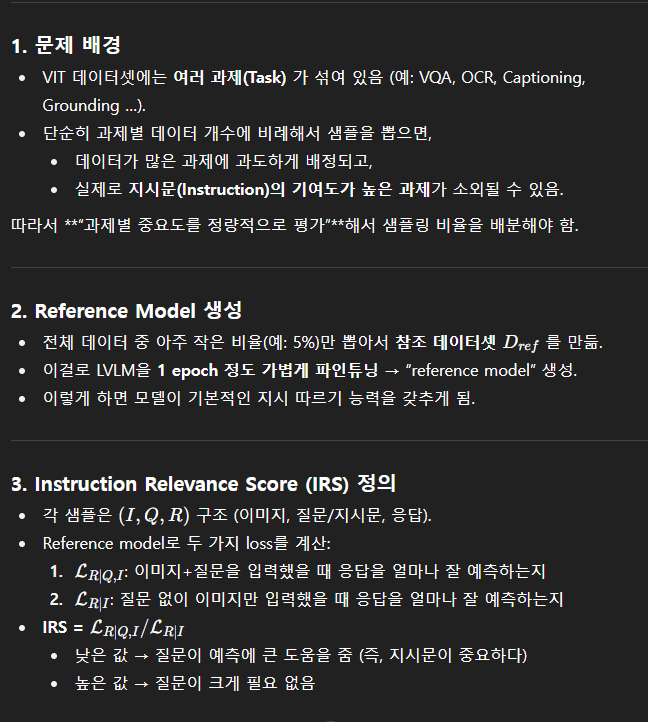최근 Visual instruction Tuning(VIT) data selection 연구는 고품질의 소수의 image-text pair의 데이터만을 골라내어 전체 training과 유사한 성능을 유지하면서, 실행시간을 줄이는 데 초점을 맞추고 있다.
