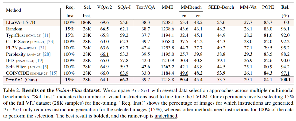 따라서 연구팀은 LLaVA-1.5-7B모델에서 Vision-Flan에서도 실험해 PreSel이 과제 다양성이 커져도 잘 작동하는지 검증함.