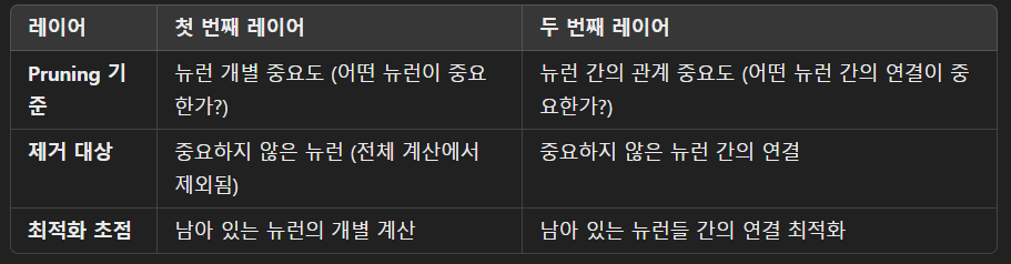 첫 번째 레이어에서는 뉴런 단위로 Pruning을 수행했지만, 두 번째 레이어에서는 관계 단위로 최적화하여 중요한 관계를 보존하면서도 계산량을 줄인다.