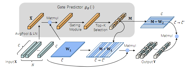 현재 입력에 가장 적합한 뉴런 하위 집합을 선택하여 행렬 곱셈에서의 계산을 줄이는 동적 게이트 선형 계층(DGL)을 제안한다.