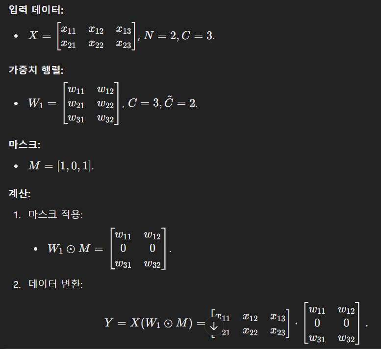 -> 입력 데이터에서 중요한 정보만 남겨놓는 역할(두 번째 M^T를 곱해주는 Y=X(W2⊙M^T)부분은 W2의 차원에 맞게 M도 전치시킴)