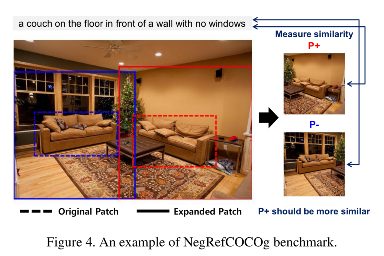 - VLM의 부정 표현 이해 능력을 측정하기 위한 벤치마크인 NegRefCOCOg를 제안