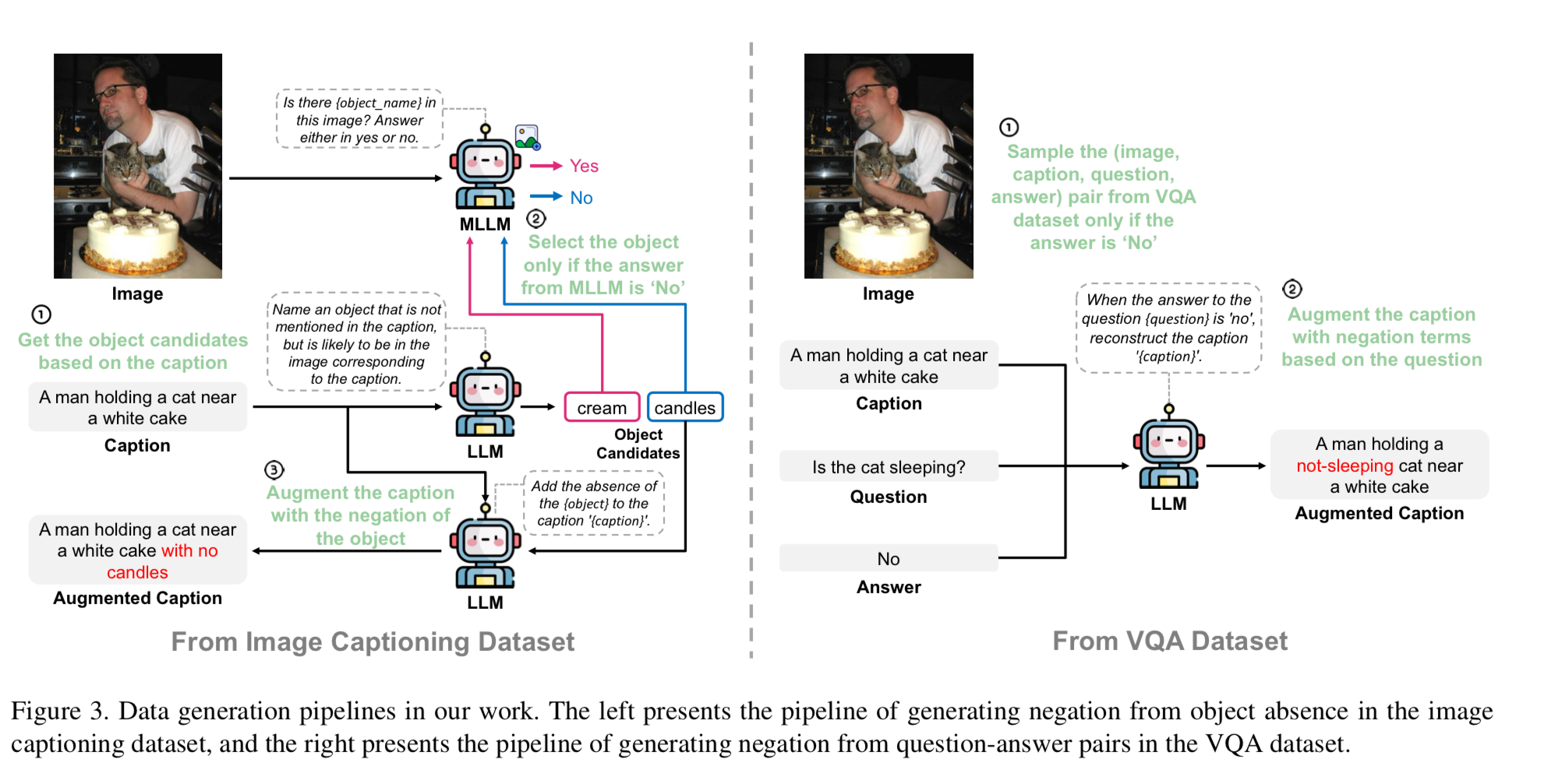 이러한 data의 한계를 완화하기 위해 LLM과 MLLM을 활용하여 부정적인 의미의 Caption 생성하고 Image와 정확하게 align되도록 두 가지 data generation 파이프라인을 제안한다.