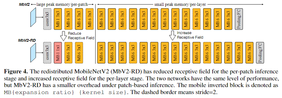 하지만, 이 방법을 사용하면 패치와 계산 오버헤드가 겹치게 되어, receptive field와 FLOP을 후반 단계로 이동하고 계산 오버헤드를 줄이기 위해 receptive field 재분배를 추가로 제안한다.