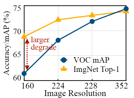 Image classification보다 Object detection에서 이미지의 해상도가 accuracy에 매우 민감함을 보여주는 그래프