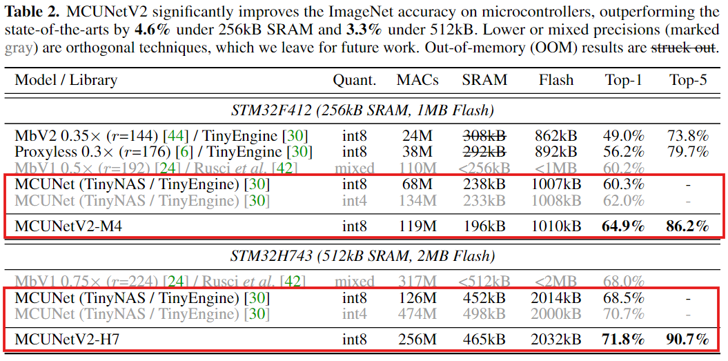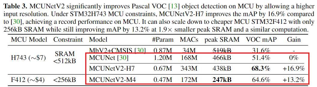 - H743(512kB)에서 MCUNetV2-H7 mAP 68.3%, 기존(MCUNet 51.4%) 대비 +16.9%p