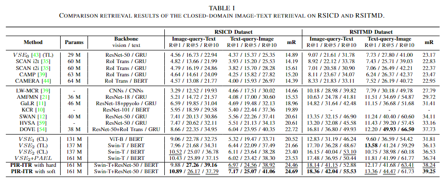 RSITR은 이미지 또는 텍스트를 사용하여 대규모 Remote sensing database에서 일치하는 텍스트 또는 이미지를 검색하는 작업을 수행한다.