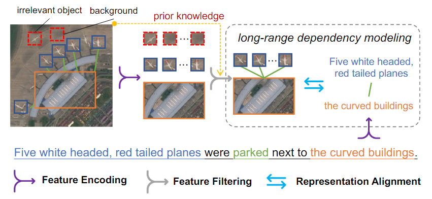 그러나, 이러한 방법들은 CNN-based vision representation 및 RNN-based text representation에 의존하고 있으며 long-range dependency modeling 및 remote sensing 데이터 증가에 효과적이지 않았다.
