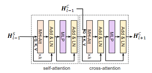 시퀀스 에 시퀀스 를 병합하여 MHA를 적용하고 레이어 정규화를 수행한 결과에 를 더한다
