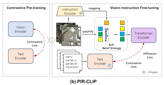 이 논문에서는 PIR을 기반으로 한 2단계 CLIP 기반 method인 PIR-CLIP을 제안하여, Remote sensing vision-text representation의 Semantic noise문제를 해결하고, open-domain image-text retrieval성능을 향상시킨다.