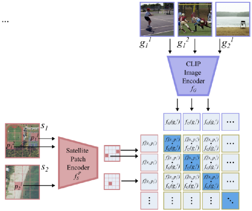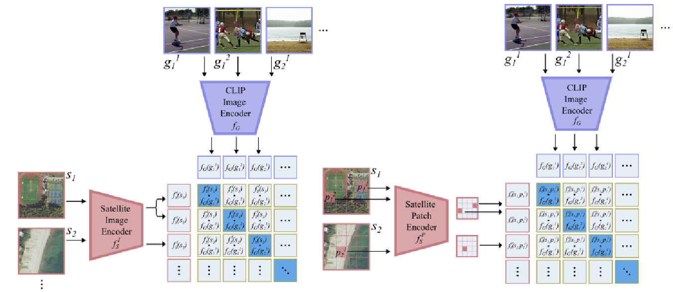 이를 위해 CLIP과 같은 Contrastive learning을 사용하여 Remote sensing 이미지와 해당하는 지상 이미지 pair를 가깝게 Align하고, 관련 없는 Image pair는 멀어지도록 학습한다.
