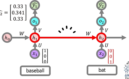 W에 대한 기울기는 입력시퀀스 전체에 대한 기울기 이므로 baseball에 대한 기울기 + bat에 대한 기울기로 구해야 한다.