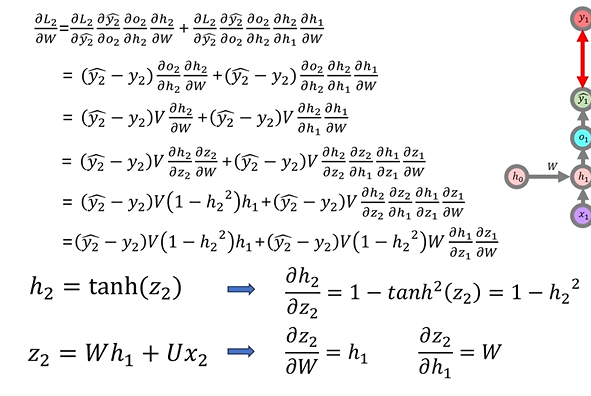 - L2에 대한 W의 기울기는 h0에서 h1로 이어지는 W와 h1에서 h2로 이어지는 W의 영향을 받는다.