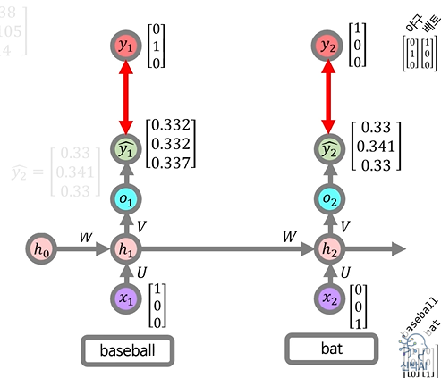 baseball을 넣었을 때인 y1, bat를 넣었을 때인 y2값이 기대하는 출력벡터 값인 "야구 = [0,1,0]", "배트 = [1,0,0]"값과 얼마나 차이나는지 계산한다