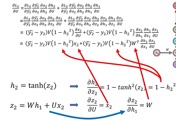 - h2 = tanh(h1W + x2U)를 h2 = tanh(z2)로 치환시켜 미분