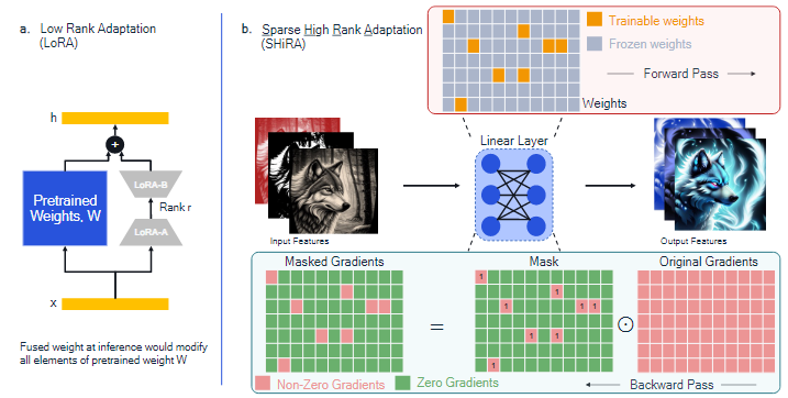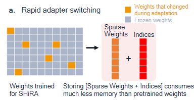 SHiRA는 pre-training된 모델에서 매우 sparse하게 trainable parameter를 활용한다.