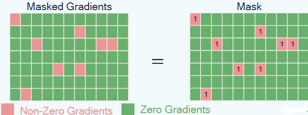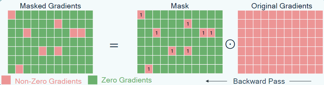 이렇게 만들어진 mask 은 Hadamard 곱셉을 사용하여 backpropagation 과정에서 Gradient를 masking하는 데 사용된다.
