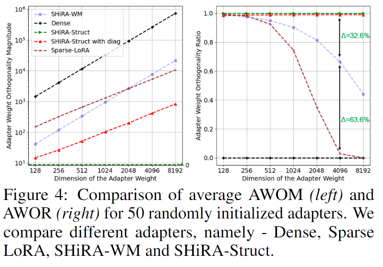 SHiRA-Struct 어댑터는 매우 희소한(non-overlapping) 마스크 덕분에 서로 다른 어댑터 간 내적 가 거의 0에 수렴하여, LoRA보다 훨씬 강한 직교성(orthogonality) 을 가진다.
