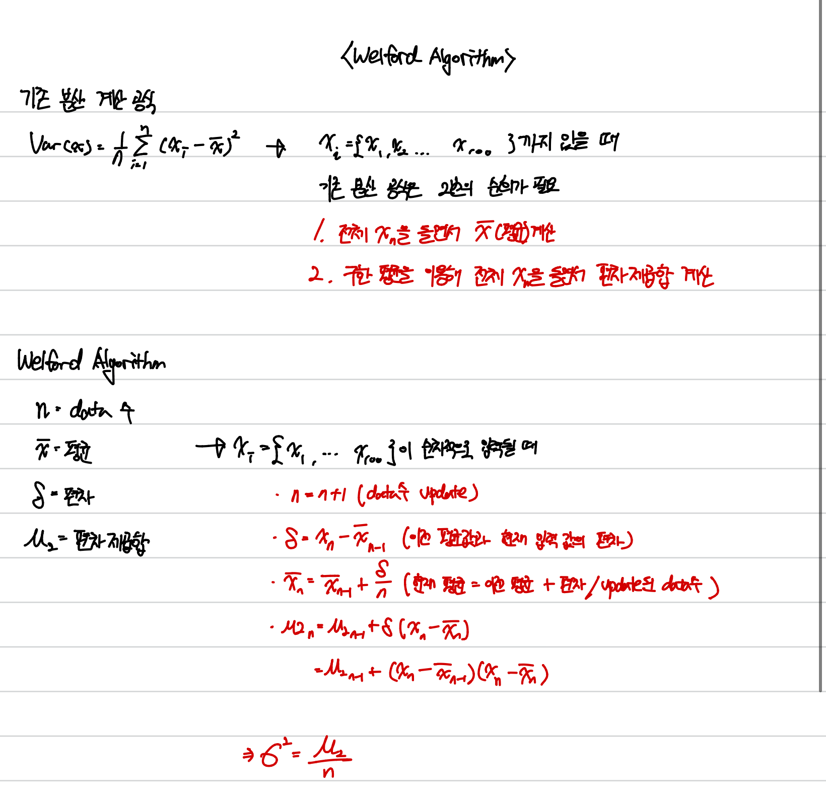 Welford's algorithm은 j번째 샘플을 관찰한 후 평균 와 누적합 를 업데이트하여 수치적으로 안정적인 계산을 보장한다.
