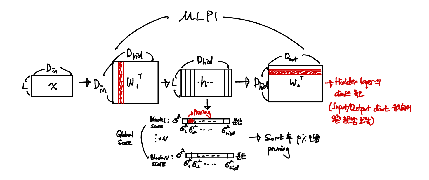 다양한 아키텍처에 배포할 수 있도록 transformer block 내 MLP layer에만 pruning을 수행한다.