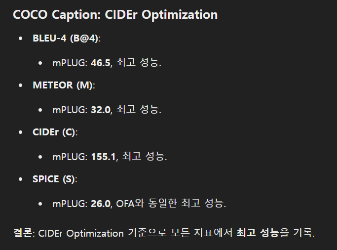 - CIDEr Optimization: CIDEr 점수를 높이기 위한 최적화 방식.