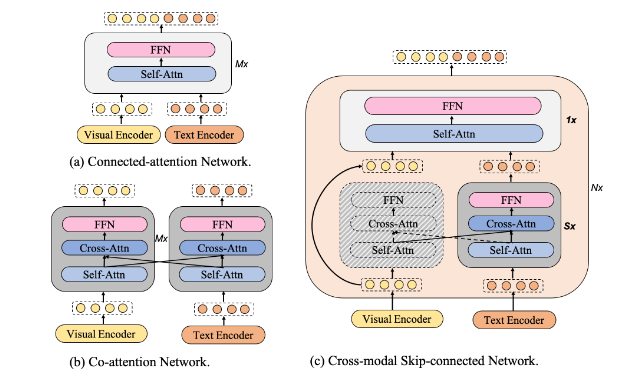 Modal Skip-connected Network는 이미지와 텍스트를 결합하여 처리하는 네트워크이다. 이 네트워크는 여러 개의 Multi Skip-connected Fusion Blocks로 구성되어 있다.(Connected Attention과 Asymmetric Co-Attention 블록)