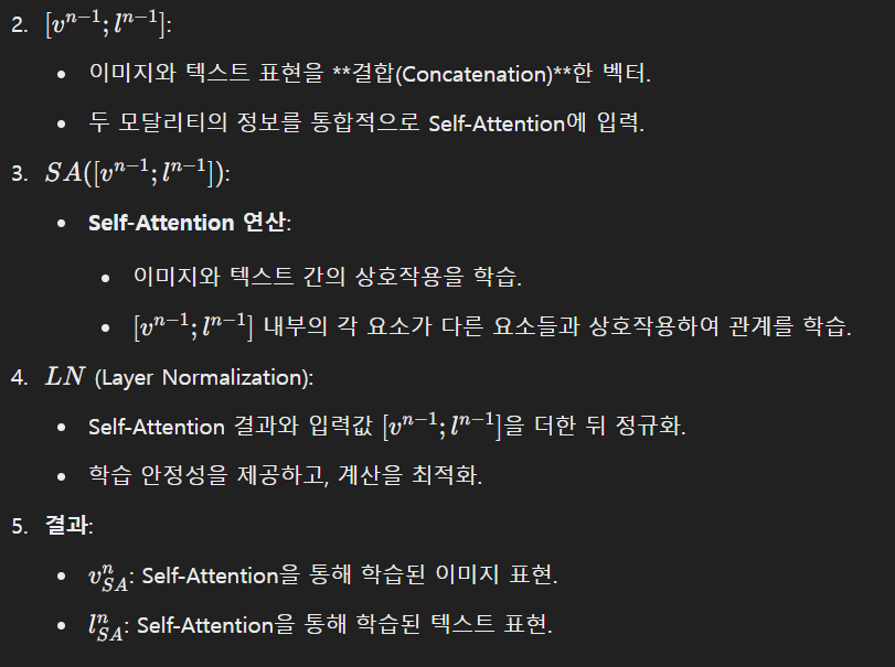 이전 단계에서 입력된 텍스트와 이미지 특징을 연결하여 하나의 벡터로 만든 뒤 셀프 어텐션의 입력으로 사용한다.