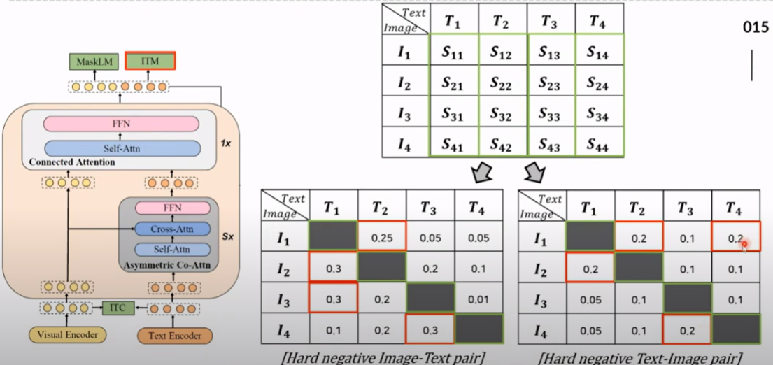 이후 모델이 이미지와 텍스트가 맞는지 아닌지를 예측한다.학습을 더 정확하게 하기 위해 아주 비슷하지만 틀린 쌍(하드 네거티브)를 활용한다.