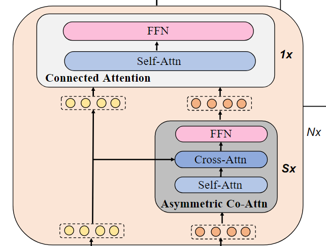 먼저, 단일 모달 인코더에서 나온 텍스트 특징과 이미지 특징을 S개의 비대칭 공동 어텐션 레이어를 통해 처리한 후, 출력된 텍스트 특징과 이미지 특징을 하나의 연결된 어텐션 레이어에 결합한다. 이 스킵 연결 융합 블록은 최종 연결된 이미지와 텍스트 표현을 얻기 위해 N번 반복된다.
