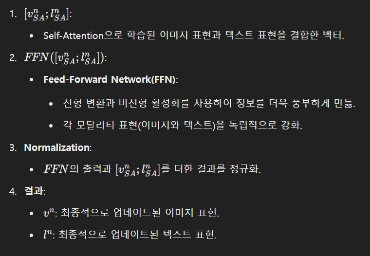 (이미지 네트워크에서는 Query가 이미지 패치에서 생성되고, Key와 Value는 텍스트 토큰에서 생성된다.)이미지 네트워크에서는 텍스트 정보를 반영한 시각적 특징을 출력하게 되고, 텍스트 네트워크는 이미지 정보를 반영한 언어적 특징을 추출하게 되고, 이후 각각의 네트워크에서 Feed Forward Network를 통해 각 시퀀스의 특징을 강화하여 표현을 각각 생성한다.