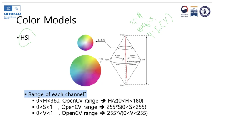 - Hue(색상): 무슨 색인가? (빨강, 초록, 파랑)
