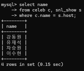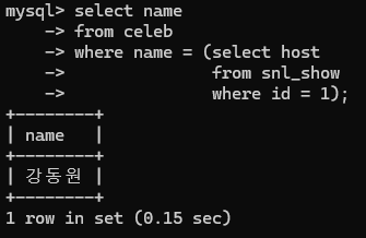 ➡️ 서브쿼리에 id=1인 값만 호출 (결과값 1개)