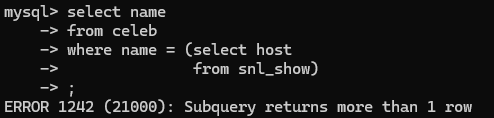 📍where 절에서 사용할 수 있는 싱글 로우 서브쿼리는 메인쿼리가 서브쿼리의 모든 값과 일치하는 값을 불러온다.