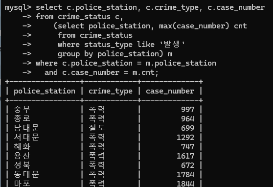 - exists는 col_name 없이 바로 쓴다. select name from police_station p where exists (select police_station from crime_status c where p.name = c.reference and case_number > 2000);