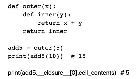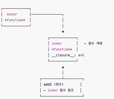 → inner 함수는 외부 함수 outer의 변수 x=5를 기억하고 있음. add5는 사실상 "y를 받아서 5 + y를 계산하는 함수 객체" 이때 x=5 값은 add5 함수 객체의 내부 속성(closure)에 저장됨