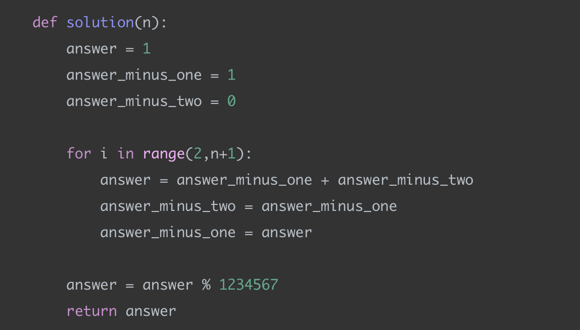 2 이상의 n이 입력되었을 때, n번째 피보나치 수를 1234567으로 나눈 나머지를 리턴하는 함수, solution을 완성해 주세요.