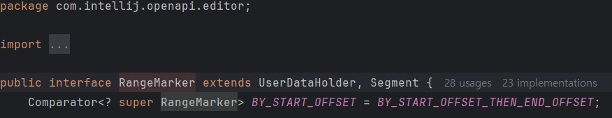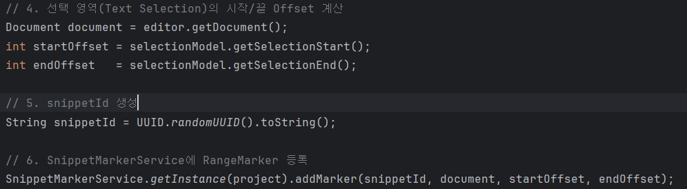 RangeMarker는 IntelliJ 자체에서 소스 코드를 저장하기 위한 기능이고 이벤트기반 리스너와 같이 사용한다. 그림에서 보다시피 코드 스니펫의 해당 파일 기준 start_offset과 end_offset을 넣어 객체 형태로 관리한다.