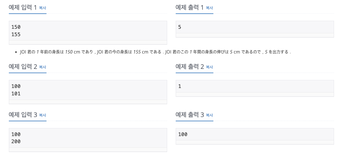 # 백준 #24086 (Height) # Previous_Height 입력 Previous_Height = int(input()) # Present_Height 입력 Present_Height = int(input()) # 결과 출력 print(Present_Height - Previous_Height)