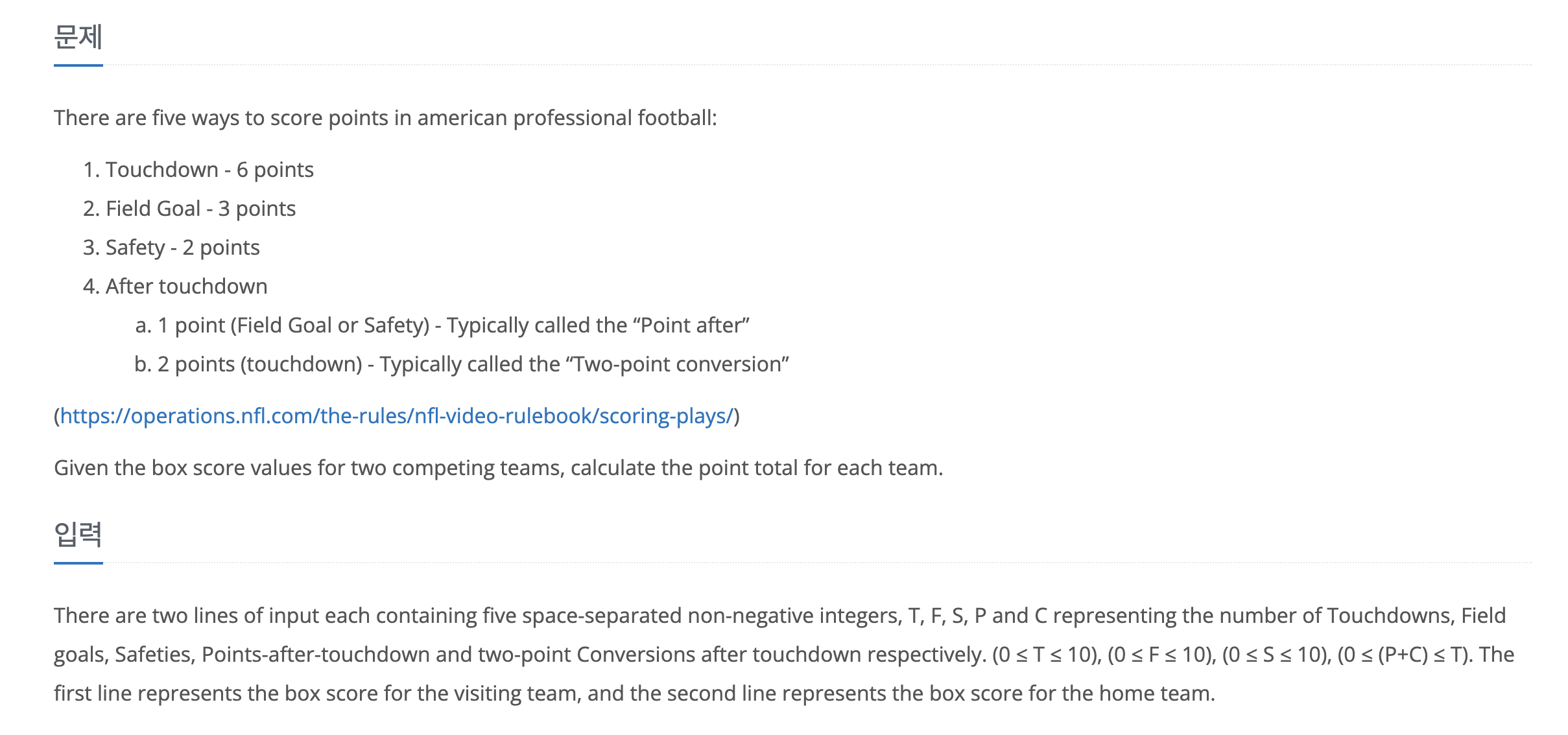 # 백준 #24736 (Football Scoring)