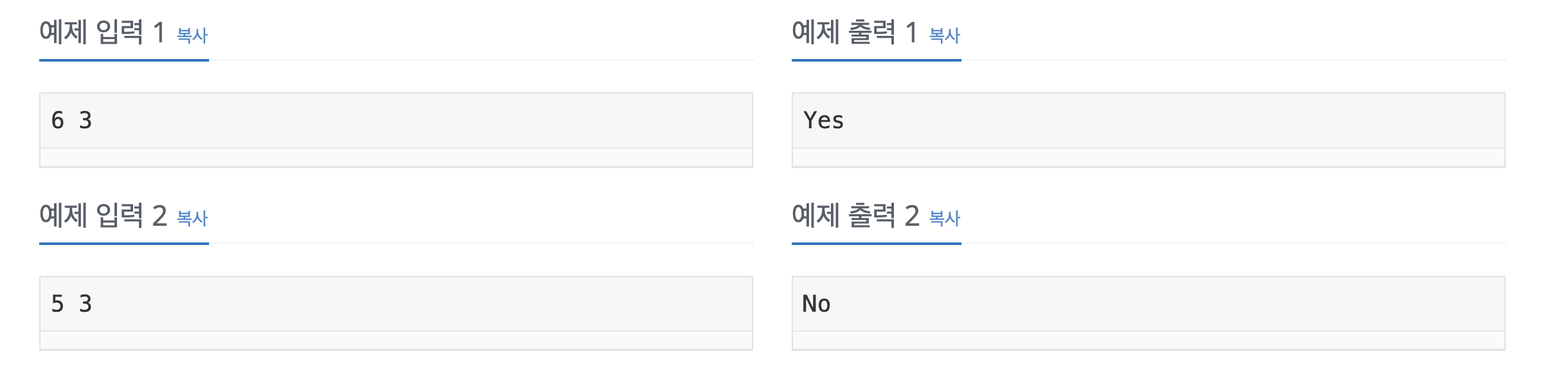# 백준 #31450 (Everyone is a winner) # M, K 입력 # M : 메달 수 # K : 아이들 수 M, K = input().split() M = int(M) K = int(K) if M % K == 0 : print("Yes") else : print("No") # M % K == 0 경우에만 YES