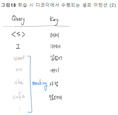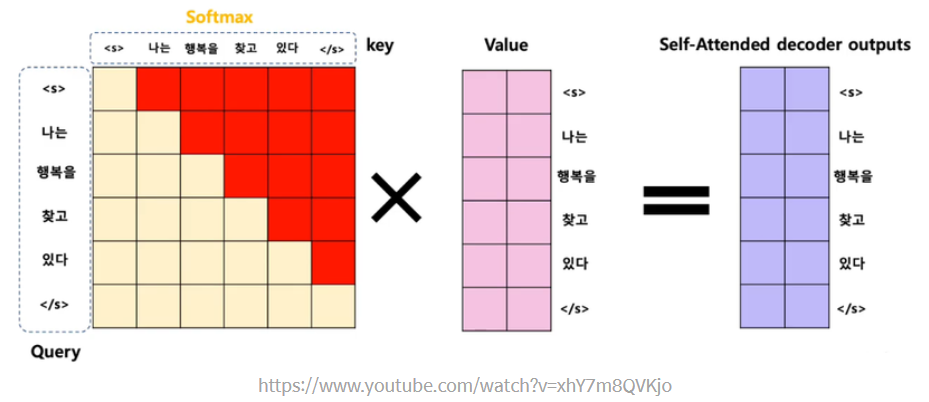 , ๋์ฝ๋์ ์ฒซ๋ฒ์งธ ์๋ธ์ธต์์ ์ด๋ฃจ์ด์ง, self-attention์ ํตํด ์ป๋ attention score matrix์์ Q ๋ค์ K ๋จ์ด๋ค์ ๋ํด ๋ง์คํนํจ