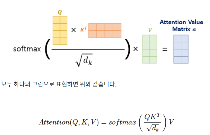 ๐ ์์ ๊ฐ์ด ๋ด์ (dot product)์ ํตํด ๋จ์ด ๋ฒกํฐ ๊ฐ ์ ์ฌ๋๋ฅผ ๊ตฌํ ํ ํน์ ๊ฐ์ ๋ถ๋ชจ๋ก ๋๋ ์ฃผ๋ ๋ฐฉ์์ผ๋ก Q์ K์ ์ ์ฌ๋๋ฅผ ๊ตฌํ๋คํ์ฌ ์ค์ผ์ผ๋ ๋ท ํ๋ก๋ํ ์ดํ ์ (Scaled Dot Product Attention)์ด๋ผ๊ณ ํ๋ค. ํน์ ๊ฐ์ ๋ถ๋ชจ๋ก ๋๋์ง ์์ ์ดํ ์ ์ ๋ท ํ๋ก๋ํธ ์ดํ ์ (dot product attention)์ด๋ผ๊ณ ๋ถ๋ฅธ๋ค.