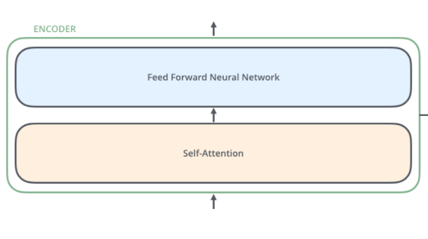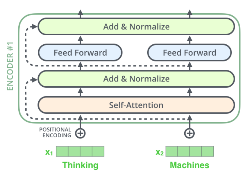 2๊ฐ์ sub-layer๋ฅผ ๊ฐ์ง(self-attention layer, feed forword neural network layer)