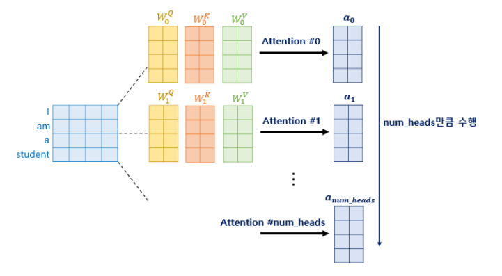์ num_heads ๋งํผ ๋ณ๋ ฌ๋ก ์ํ.(num_heads๋ hyperparameter) ์ด ๋ ๊ฐ๊ฐ์ ์ดํ