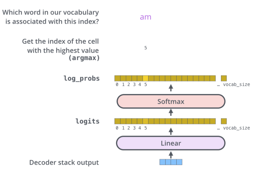 ๐ Linear Layer: fully-connected ์ ๊ฒฝ๋ง์ผ๋ก ๋์ฝ๋์ ์ถ๋ ฅ ๋ฒกํฐ๋ฅผ ํจ์ฌ ๋ ํฐ ์ฌ์ด์ฆ์ธ logits ๋ฒกํฐ๋ก ํฌ์์ํด. ์๋ฅผ ๋ค์ด 10,000๊ฐ์ ์์ด ๋จ์ด๋ฅผ ํ์ตํ์๋ค๊ณ ๊ฐ์ ํ๋ฉด logits vector์ ํฌ๊ธฐ๋ 10,000์ด ๋จ. ๋ฒกํฐ์ ๊ฐ ์์๋ ๊ฐ ๋จ์ด์ ๋ํ ์ ์