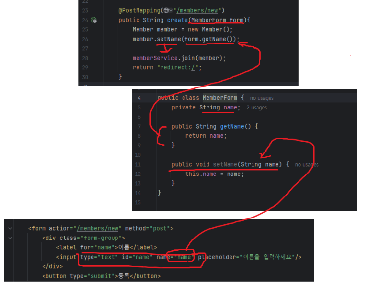 Mapping 두 가지의 url은 같지만 Post 방식으로 보냈기 때문에 PostMapping이 받는다.