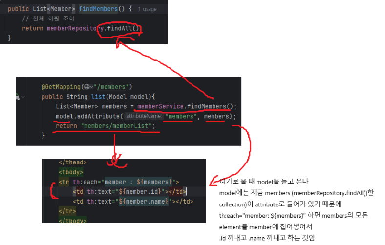 템플릿 엔진이 렌더링을 해줌 th:each로 loop를 돌면서 각각에 대해서 member.id와 member.name을 출력해줌 (members는 member.findAll()했기 때문에 모든 member를 가지고 있음)