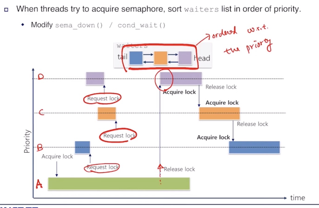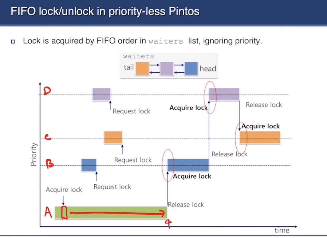 • sema_up() 또는 lock_release()에서 대기 중인 스레드 중 가장 먼저 기다린 애를 깨움